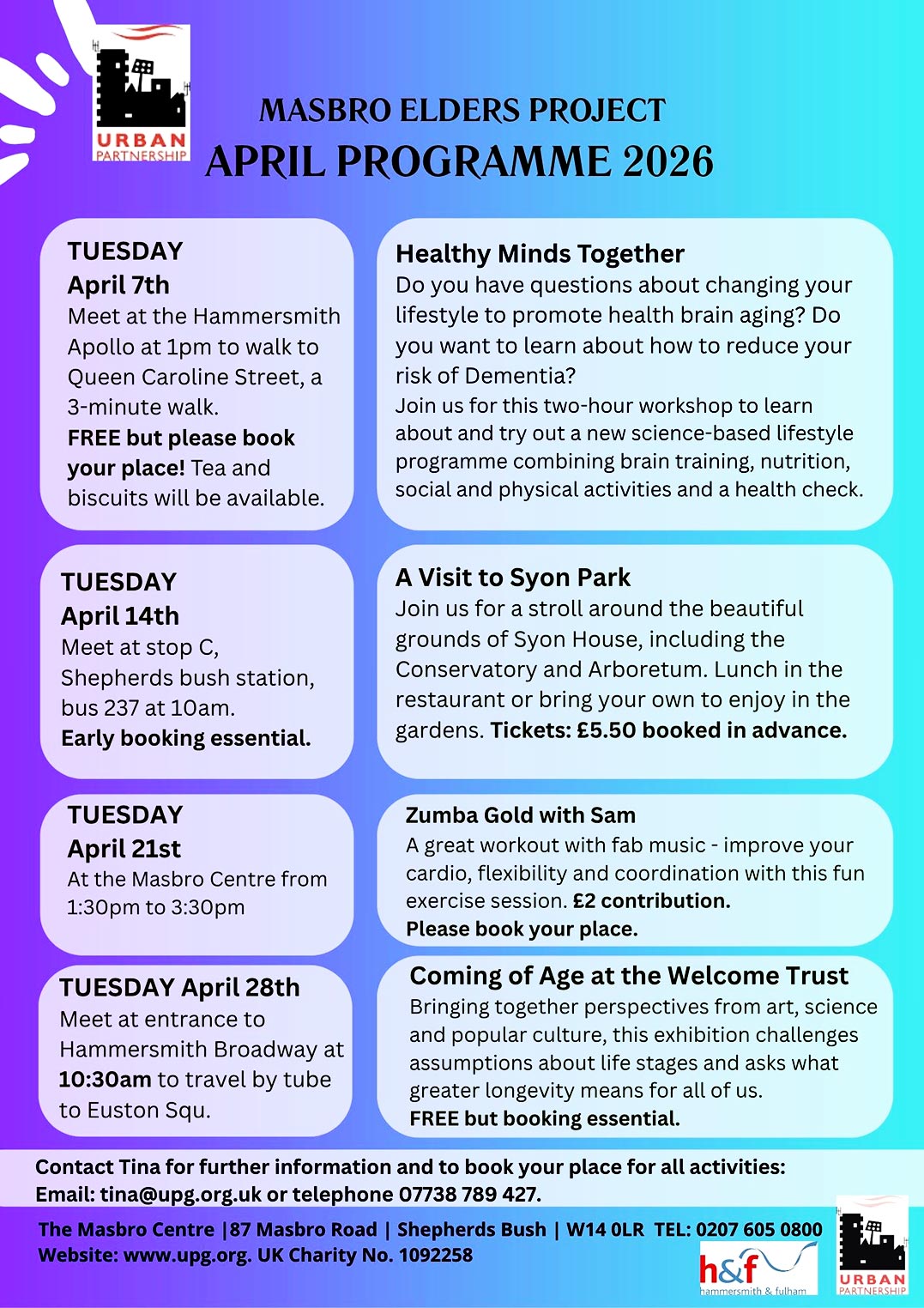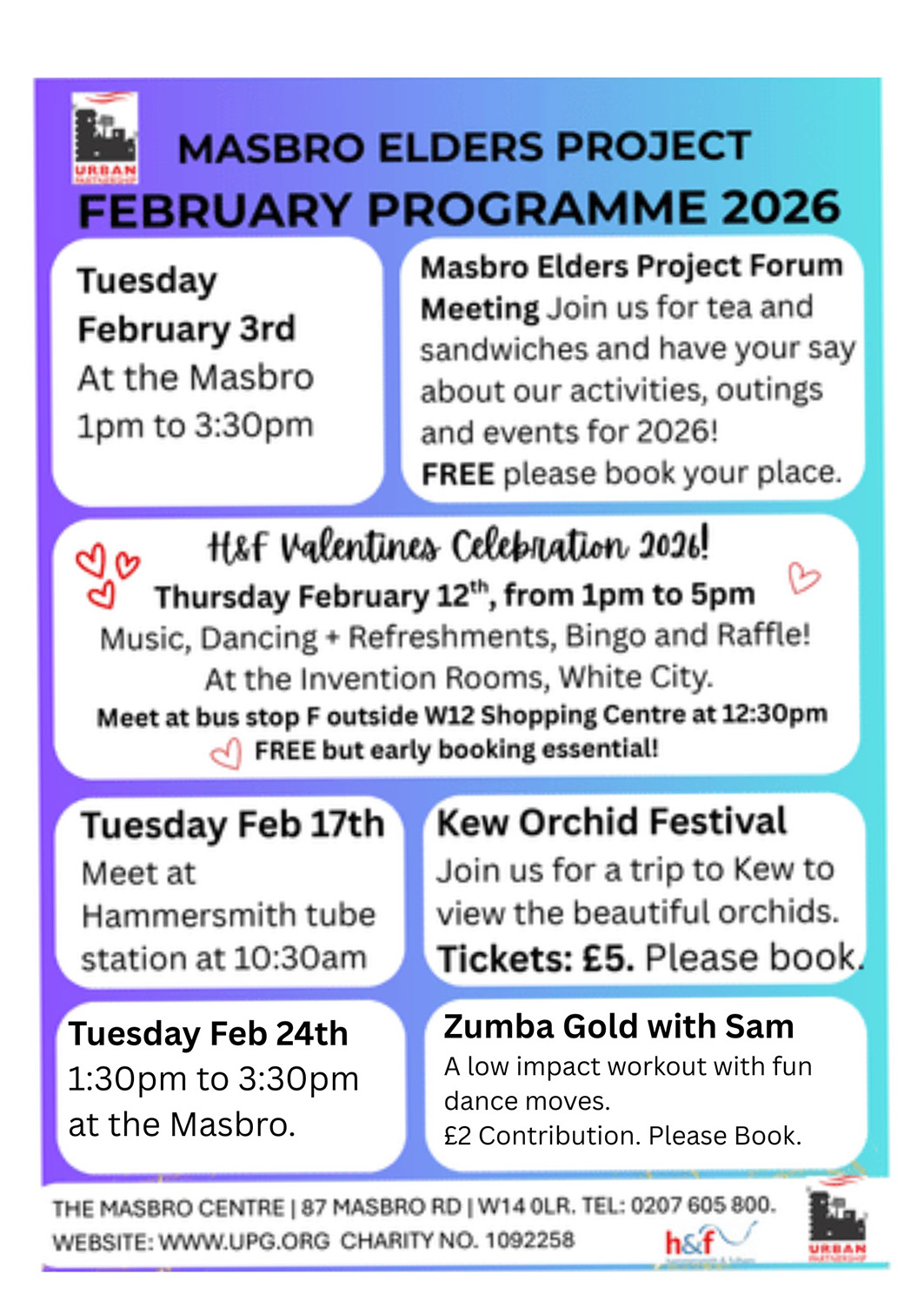 Urban Partnership Group runs community services in Hammersmith and Fulham. These include Children’s Centres, family outreach provision, borough-wide parenting programmes, nursery provision and crèche services, sports and leisure facilities, an older people service, Masbro Youth Centre, volunteering, adult education classes, employment support service, art and pottery workshops, as well as managing space for the wider community to use.