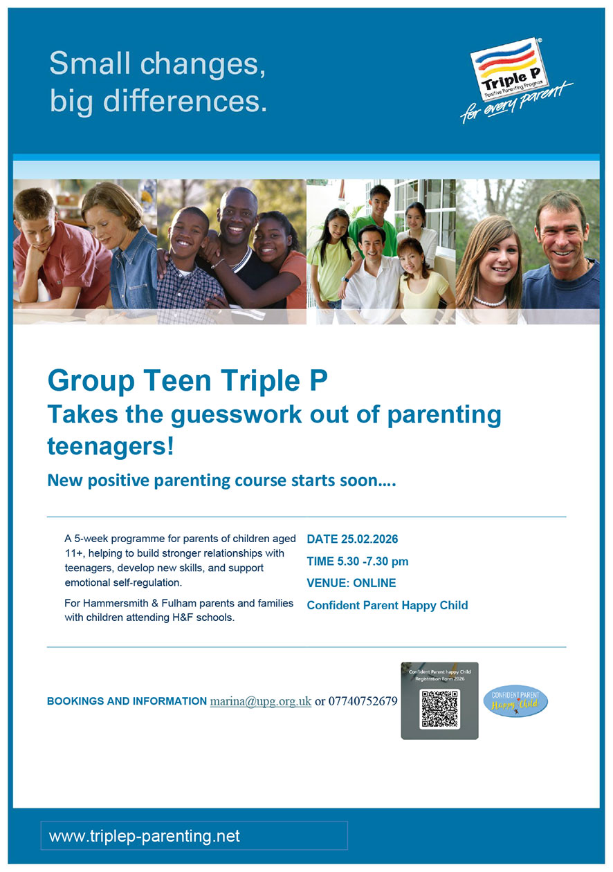 The Confident Parent Happy Child service is for parents and carers of children aged 0-18 years living in the London Borough of Hammersmith and Fulham. The project offers a range of evidence-based parenting programmes, information, advice and support for parents and carers to build positive parenting skills and work towards achieving positive outcomes for their children.
